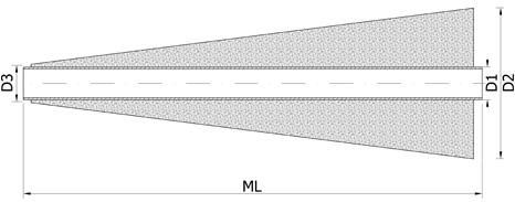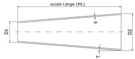 D1 min. 32 mm x 1,5 D2 max. 250 mm ML 180 - 2.200 mm Wandstärke (S) 1,5 bis 4 mm (längenabhängig) Winkel (T) von ca. 0,16 bis 10,3° |